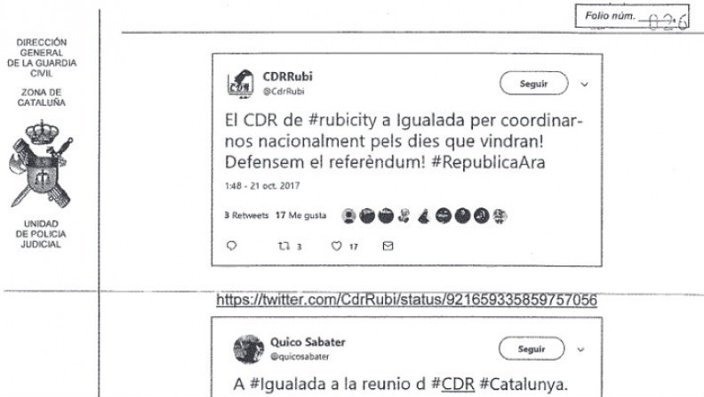 Un tuit del CDR de Rubí apareix a l'informe de la Guàrdia Civil entregat al jutge Pablo Llarena