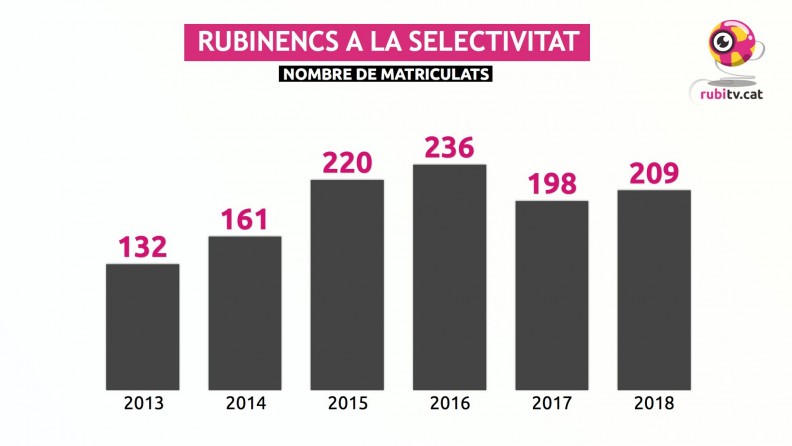 209 estudiants rubinencs, 11 més que l'any passat, inicien aquest dimarts les proves d'accés a la universitat (PAU), la Selectivitat. L'institut Duc de Montblanc és el centre rubinenc que aporta més estudiants a les proves, amb un total de 79 joves, seguit de l'institut La Serreta (45 matriculats, 30 de Batxillerat i 15 de cicles formatius) i el col·legi Maristes Rubí amb 44 estudiants. La resta, provenen dels instituts L'Estatut (19), Torrent dels Alous (16) i JV Foix (6). Amb aquestes dades, es recupera una mica el nombre d'alumnes de Rubí que enguany faran la Selectivitat després de la significativa davallada de l'any passat (veure notícia).